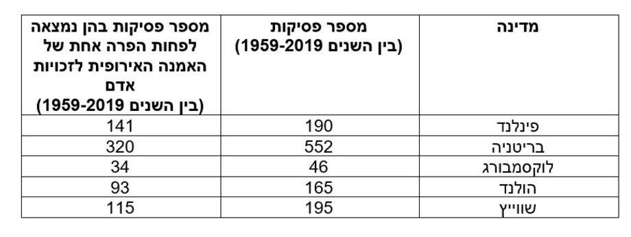 במדינות אלו יש אפוא שכבת הגנה כפולה לזכויות אדם: ההגנה החוקתית על מגילת זכויות האדם וההגנה העל-לאומית. לא מדובר במנגנון זניח. בין השנים 1959 ל-2019 התקבלו בבית המשפט האירופי לזכויות אדם מאות פסיקות לגבי מדינות אלו, בהן נמצאה לפחות הפרה אחת של האמנה האירופית לזכויות אדם, כמפורט בטבלה הבאה: