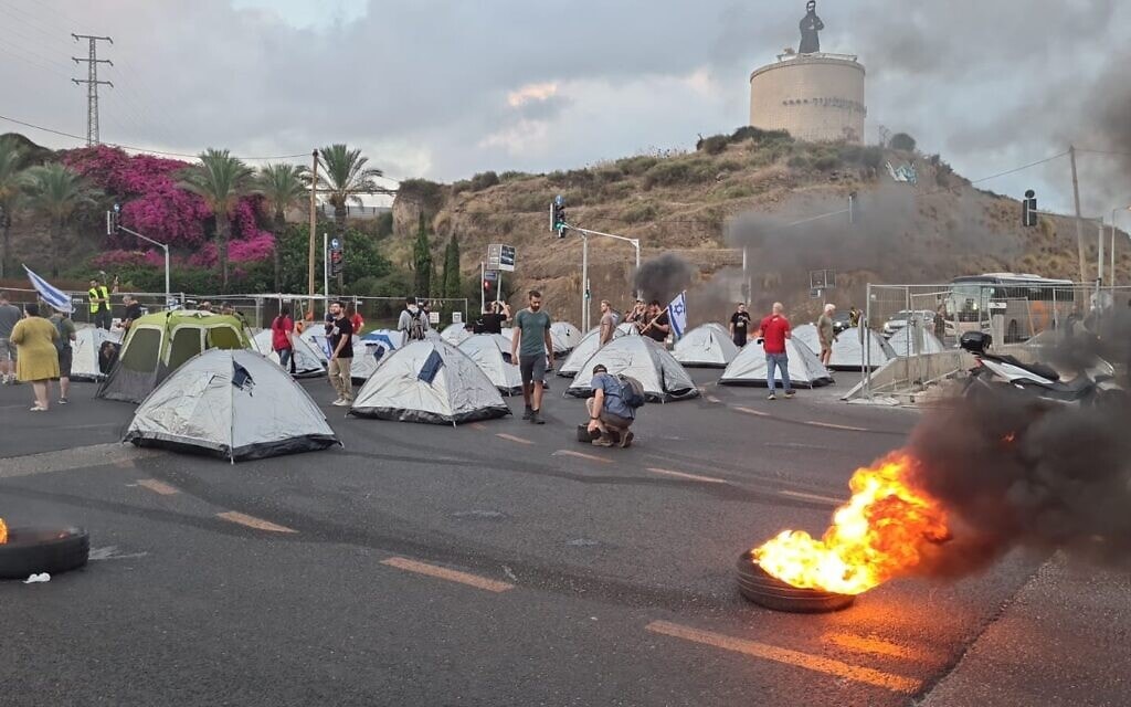 אוהלים על הכביש בצומת הסירה בהרצליה. המשטרה פינתה את הכביש בשעה 6:30.