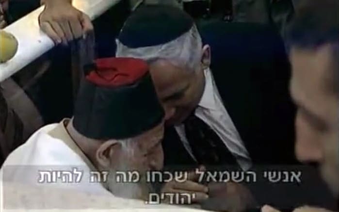 בנימין נתניהו לוחש לרב כדורי, ״השמאל שכח מה זה להיות יהודים״, ב-21 באוקטובר 1997 (צילום: צילום מווידאו)