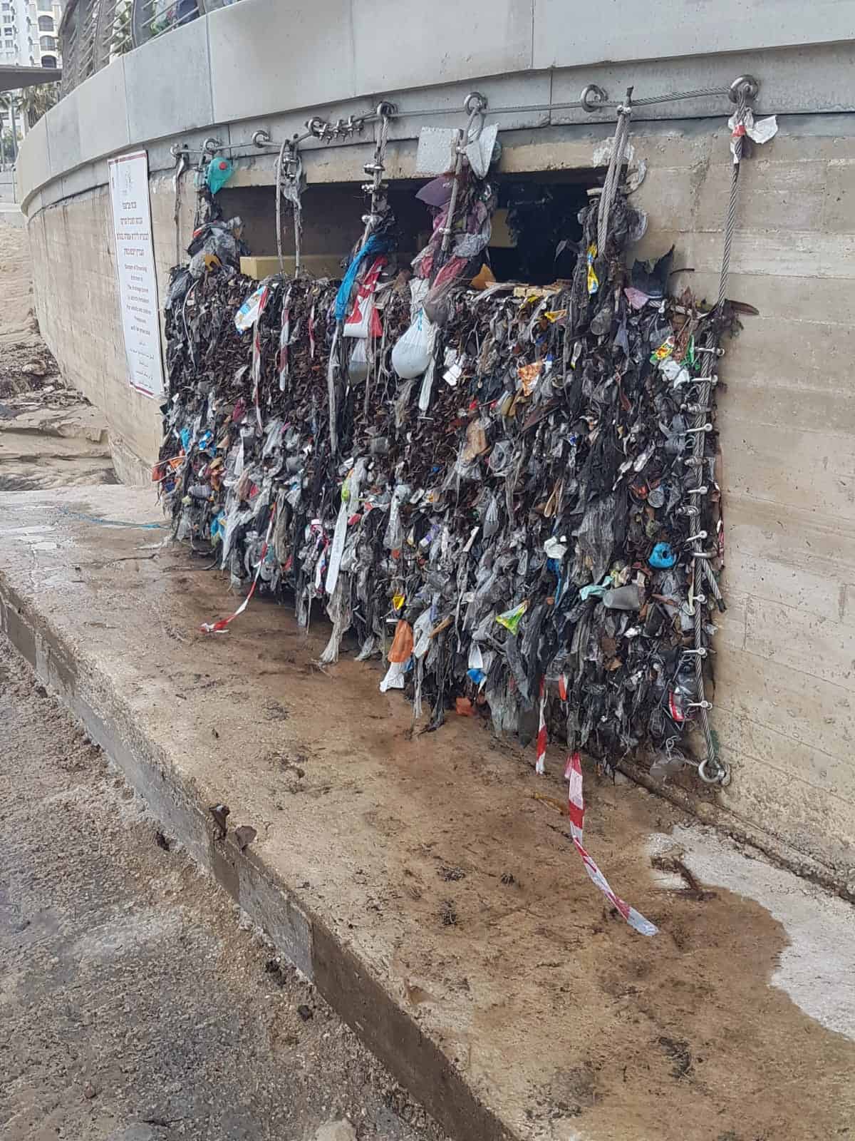 • טונות של אשפה נלכדו ברשתות שהותקנו על פתחי תעלות הניקוז, והושלכו לאשפה במקום לזרום לים כמו בשנים קודמות (צילום: מי אביבים)