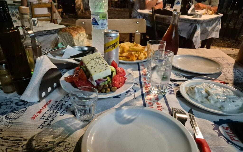 מגיעה קערה ענקית של סלט חתוך בחתיכות גדולות, מעליהן מונחת חתיכת פטה ענקית מתובלת באורגנו, ומתחתיה מתחבאת חתיכת לחם גס לספוג את המיצים. אין עידון, אוכל בסיסי ופשוט. הצ'יפס חתוך כמו תפוצ'יפס טרי ומפתה והוא פריך להפליא, איך הם מכינים אותו? צלחת צ'זיקי מרענן, חצי כיכר לחם כפרי ולעבודה. הגיע גם קנקן של משקה אלכוהולי מקומי חזק ולא מזוהה.