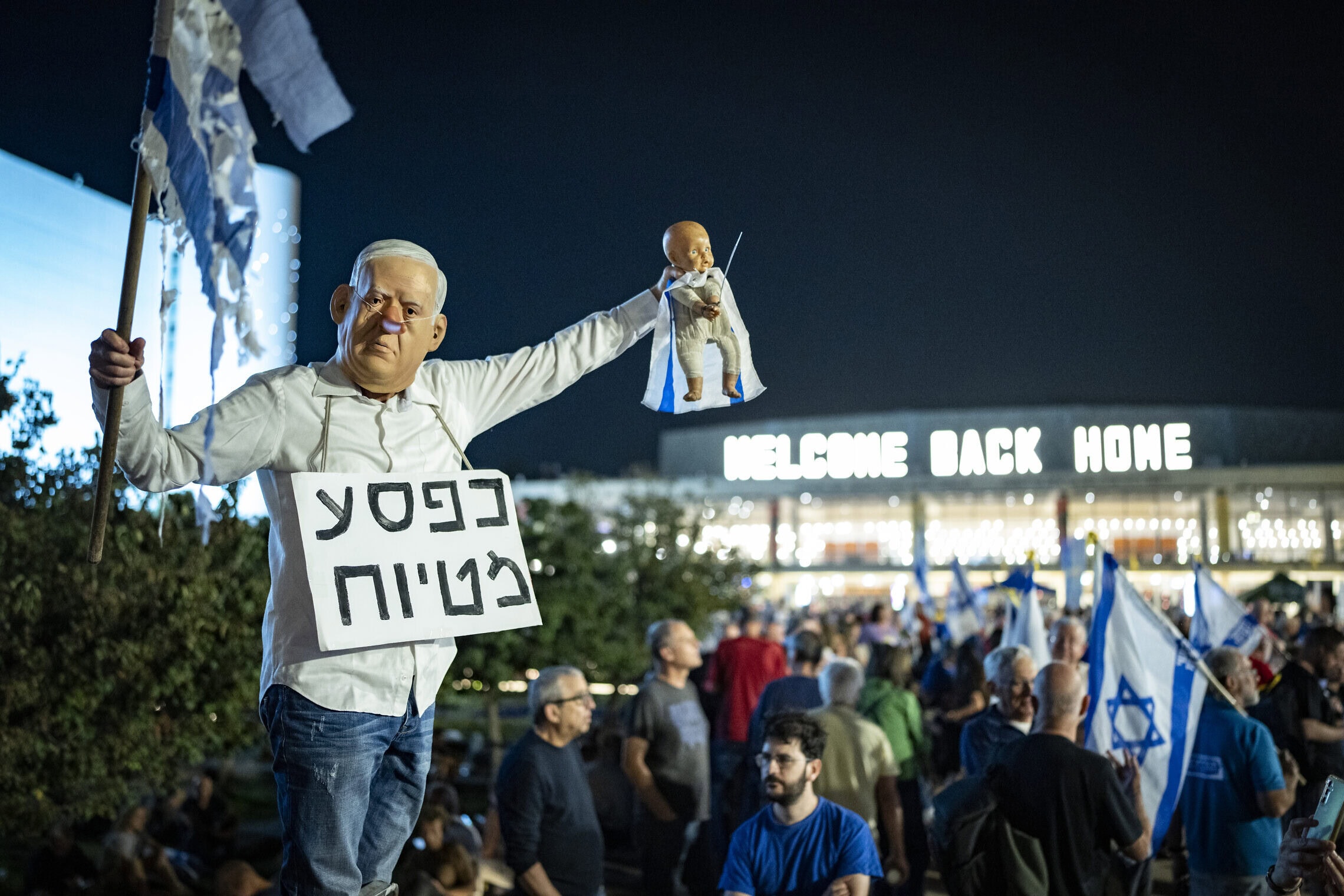 מפגין מחופש לראש הממשלה בנימין נתניהו בהפגנה למען ועדת חקירה ממלכתית. 22 בנובמבר 2025