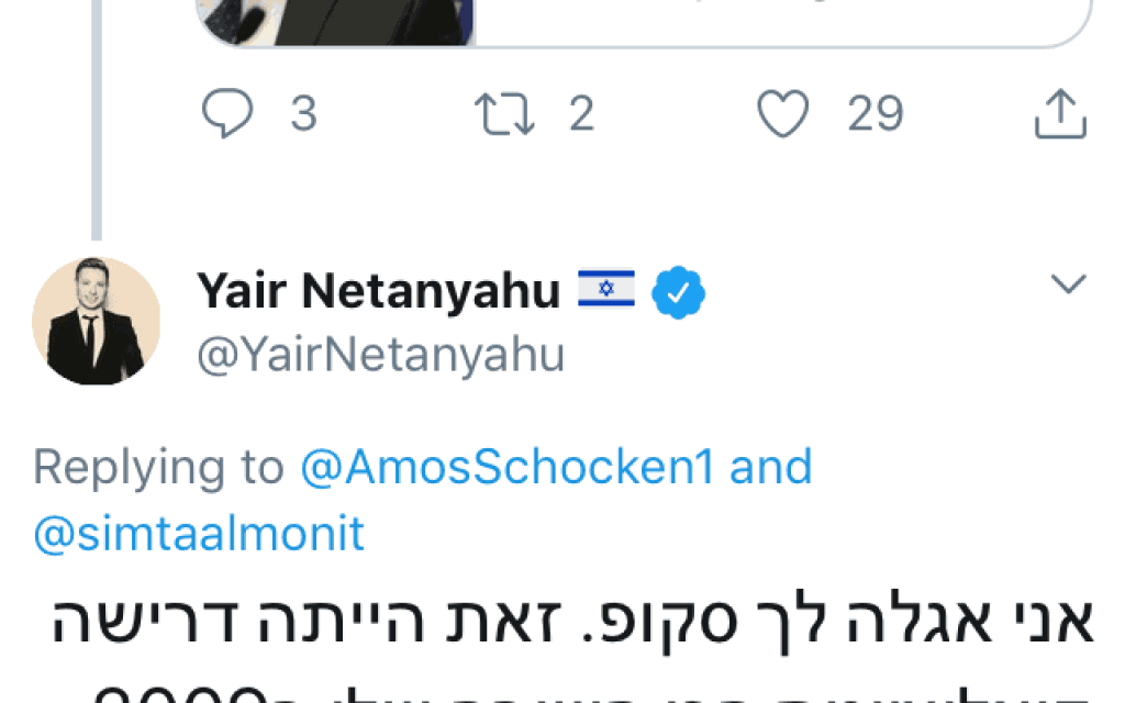 עופר גולן, דוברו האישי של ראש הממשלה בנימין נתניהו, מסר בתגובה לפרסום הציוץ מטעמו של יאיר נתניהו: "ב-2009 יאיר היה תלמיד תיכון שלא היה מעורב בכלל בעניינים פוליטיים. התגובה לעמוס שוקן מבוססת על דברים שנאמרו בשיח הציבורי בשנת 2015 סביב פרסום ספרה של עו"ד אביה אלף 'תיק ליברמן'".