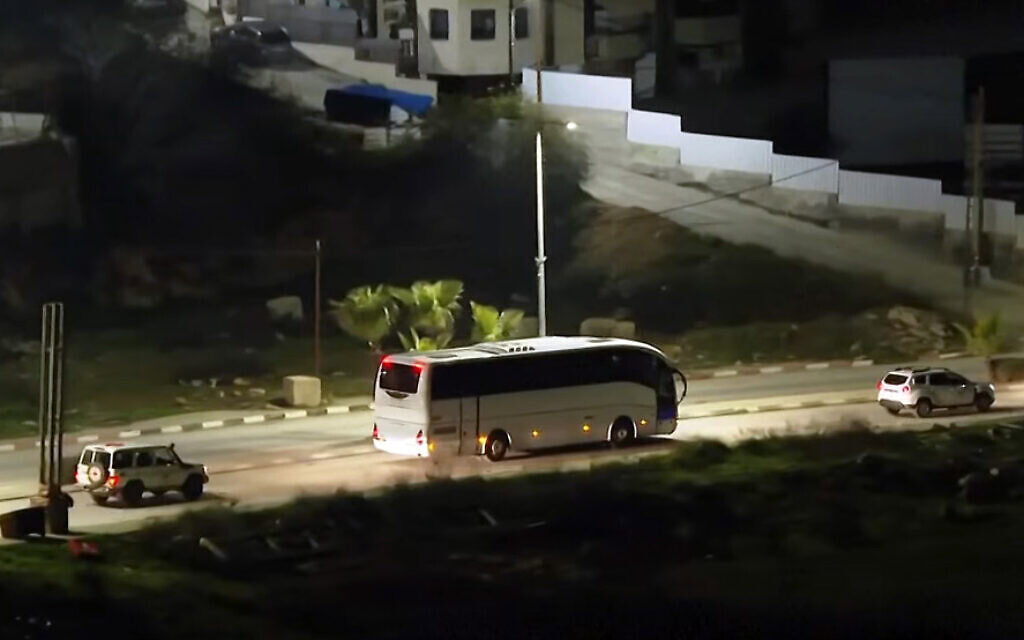 אוטובוס של הצלב האדום המלווה אסירים ביטחוניים פלסטינים יצא מכלא עופר ועושה דרכו למחסום ביתוניא ליד רמאללה, שם ישוחררו.