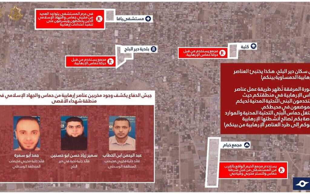 עוד נמסר בהודעת הצבא שהשלושה משתמשים בתשתיות אזרחיות לצורך פעילות טרור. במפה שפרסם צה"ל סומנו בניין העירייה בדיר אל-בלח, בית חולים, מוסד חינוכי ומחנה אוהלים שבהם המפגעים עושים שימוש.