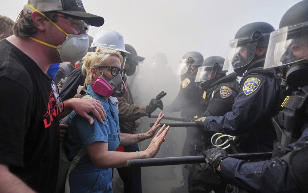 שוטרים רכובים על סוסים ניסו להשתלט על ההמון. המפגינים צעקו לעבר השוטרים "תתביישו!", ובצילומי וידאו נראו כמה מהם משליכים חפצים. קבוצה אחת אף חסמה את כביש 101 – עורק תחבורה מרכזי במרכז העיר.