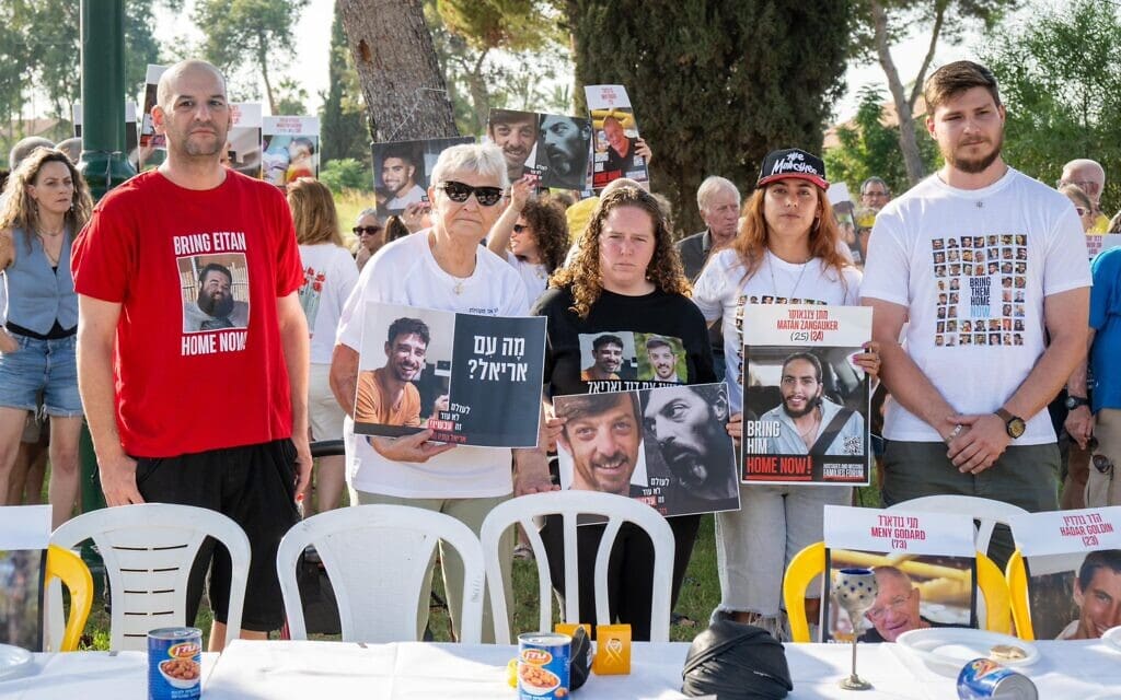 "אנחנו פה כדי להגיד לכל החטופים – אנחנו נלחמים עבורכם! עם ישראל עומד פה יחד, אנחנו לא נוותר. אנחנו דורשים מהממשלה ושר הביטחון בואו תהיו איתנו בארוחת שישי! תראו את הסבל של המשפחות והשורדים ושל עם שלם שלא ממשיך בחיים. כולנו ביחד חטופים עכשיו בעזה".